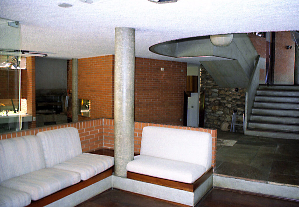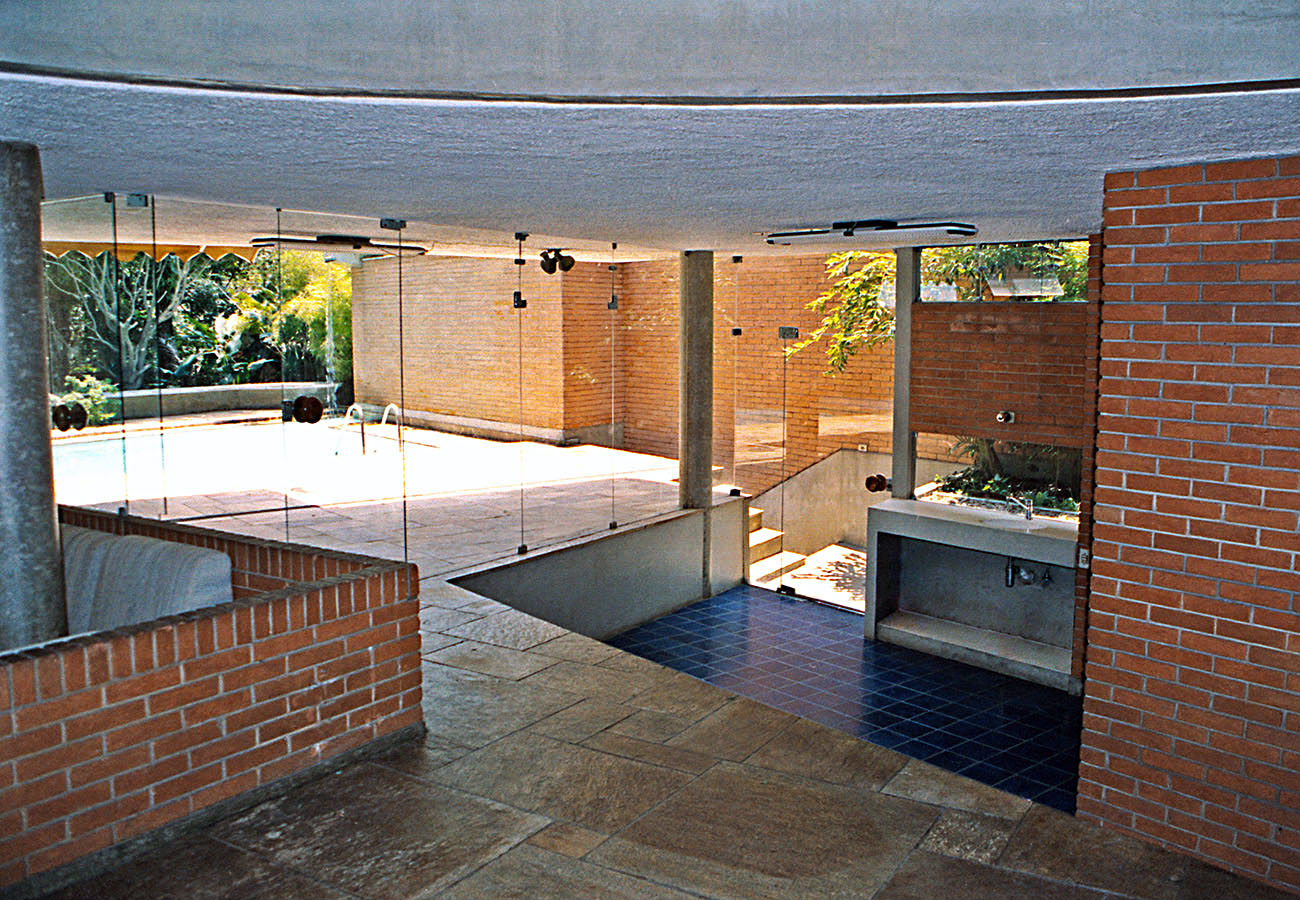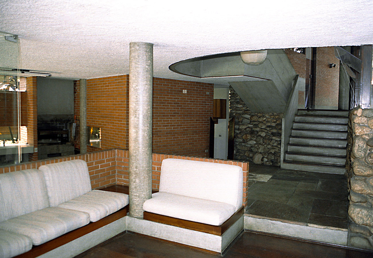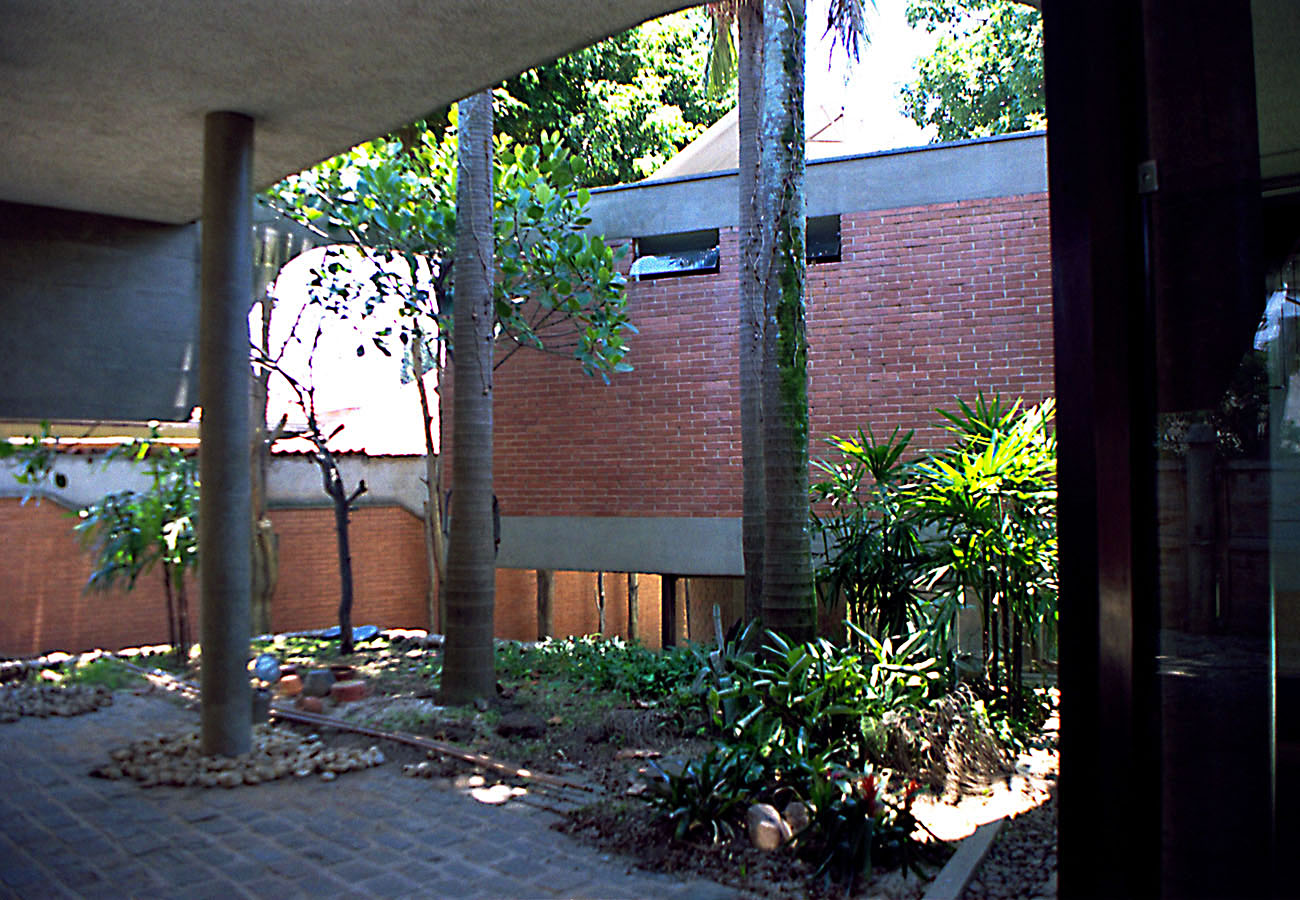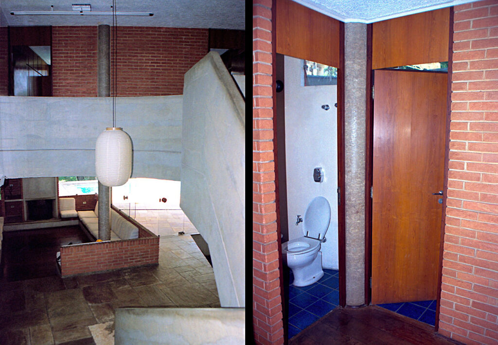 - As vedações e as partições em alvenaria de tijolos comuns foram deixados à vista. Programa enxuto e as questões de segurança que não haviam, viabilizaram a integração do interior com o exterior.