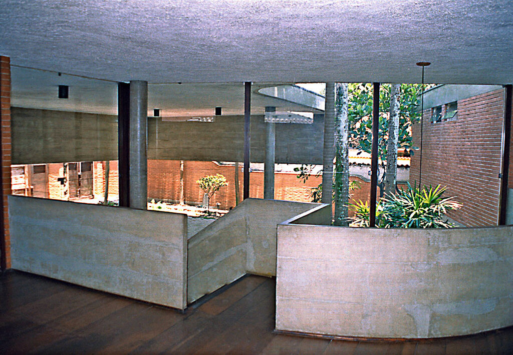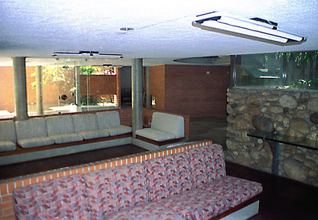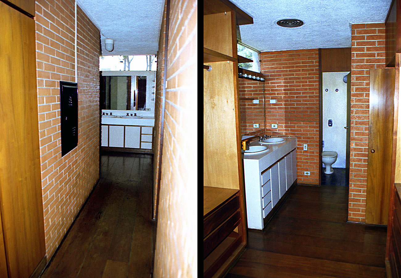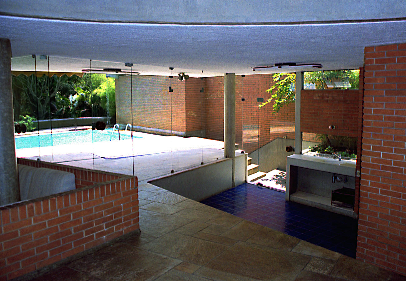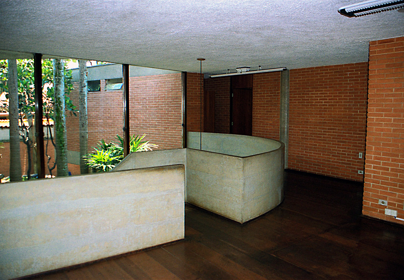 - As vedações e as partições em alvenaria de tijolos comuns foram deixados à vista. Programa enxuto e as questões de segurança que não haviam, viabilizaram a integração do interior com o exterior.